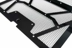 The 1 piece aluminum part has cut with a precision water jet, featuring the AP logo. Each cover is formed to provide a perfect fit replacing the stock plastic engine cover. Hexagonal stainless steel mesh is then riveted in place for a rugged look. To keep the part functional and allow easy access to your engine for servicing, a quick release push button is built into the cover. This keeps the cover secure in place for normal use while not inconveniencing you with any fixed bolting or hardware to the body. The sturdy design allows you to retain functional use of your RZR bed. Available in a variety of colors to match your unique style, the Agency Power vented engine cover is a great addition to your Polaris RZR XP 1000 or XP Turbo.