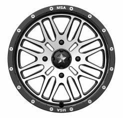 The MSA M38 Brute is engineered to be tough enough to tackle any landscape. Its 8-spoke design features a clean, gloss black machined finish with the MSA logo milled into the face of the faux beadlock ring.