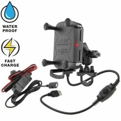 The RAMĀ® Tough-Charge⢠with X-GripĀ® Technology is the world’s first patented, universal waterproof wireless charging cradle for phones. Designed with spring-loaded RAMĀ® X-GripĀ® Technology, this cradle features an ‘X’ design that expands and contracts to secure nearly any phone while taking advantage of Qi wireless phone charging. All four arms feature rubber-coated caps that hold your phone firmly in place, and the open design keeps buttons and switches accessible on the sides of phones. To insert your device, simply squeeze the arms on one side of the cradle and place your phone inside before releasing the arms. This Qi compatible wireless charging cradle ensures your compatible phone charges no matter what position it’s placed at. For added security and peace of mind, a device tether is included thatās recommended for outdoor applications. In addition, a support leg can be adjusted to the ideal position or removed altogether. This RAMĀ® Tough-Charge⢠with X-GripĀ® Technology wireless charging handlebar kit includes a B size diamond base featuring a 1ā rubber ball, short length double socket arm, and zinc-coated U-bolt base. U-bolt hardware accommodates rails from .5″ to 1.25″ in diameter. The connected Type-A male pigtail connector features an in-line switch that allows you to turn off the wireless charging module when not in use. For in-vehicle charging, attach the pigtail to the included 1.2m Type-A male to Type-A female extension cable. This kit includes a hardwire charger.