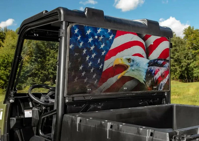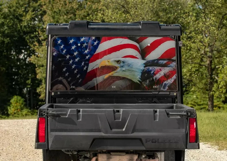 Customize your ride even more by upgrading to a printed windshield. This isn’t your run-of-the-mill vinyl decal that’s gonna peel off after a few washes or rough rides. Each design is printed directly on the windshield, producing a photo-quality rear window graphic that’s nearly impossible to scratch off. The perforated image looks solid from the outside, providing some much-needed shade.