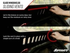 This glass windshield comes with everything you need to have a better ride. The manual wiper is positioned strategically in front of the driver’s seat so you always have the best view of what’s ahead. You also get built-in sliding vents in the frame so you can adjust your airflow on the fly to stay comfy. You’ll always be ready for the weather.
